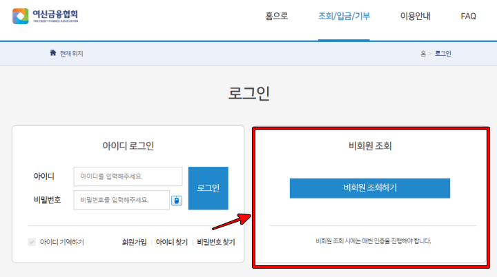 내 카드포인트 통합조회 시스템은 이러한 화면이 나옵니다. 여기서 첫번째에 있는 '통합조회/계좌입금/기부'를 통해 들어가시면 '아이디 로그인'과 '비회원 조회'가 나오는데 회원가입을 하지 않으셔도 비회원조회로 정보수집 동의와 본인인증만 하시면 조회가 가능합니다.