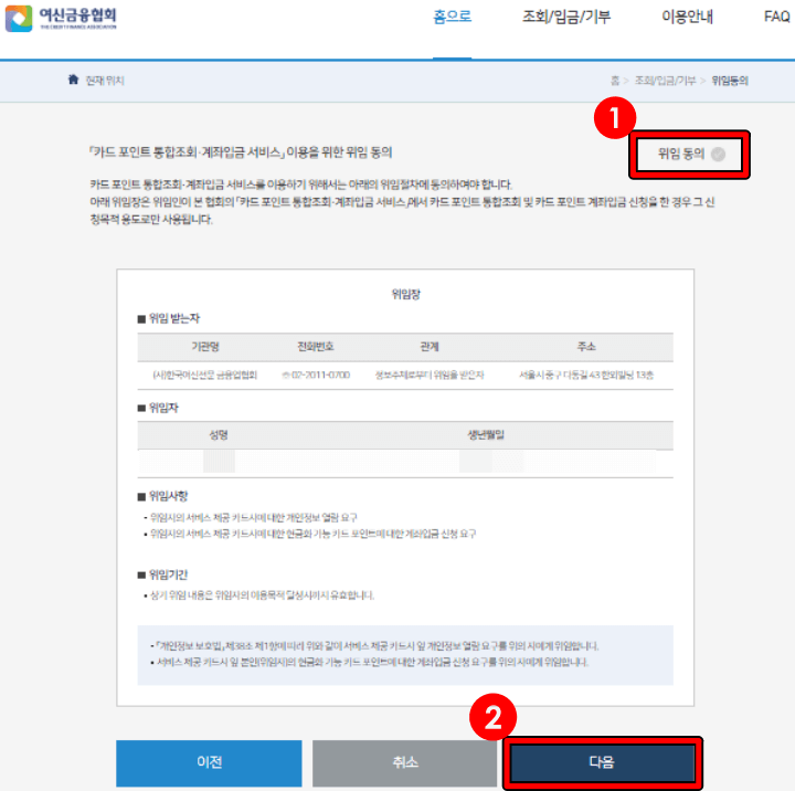 위임 동의를 체크해주시고 ,카드포인트 계좌입금/기부를 클릭해 주시면 됩니다.